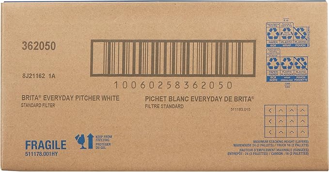 - This space efficient Brita pitcher fits perfectly on refrigerator shelves, features an easy-fill locking lid and is easy to pour; Height 10.47"; Width 5.59"; Length/Depth 10.94"; Weight 2.29 pounds