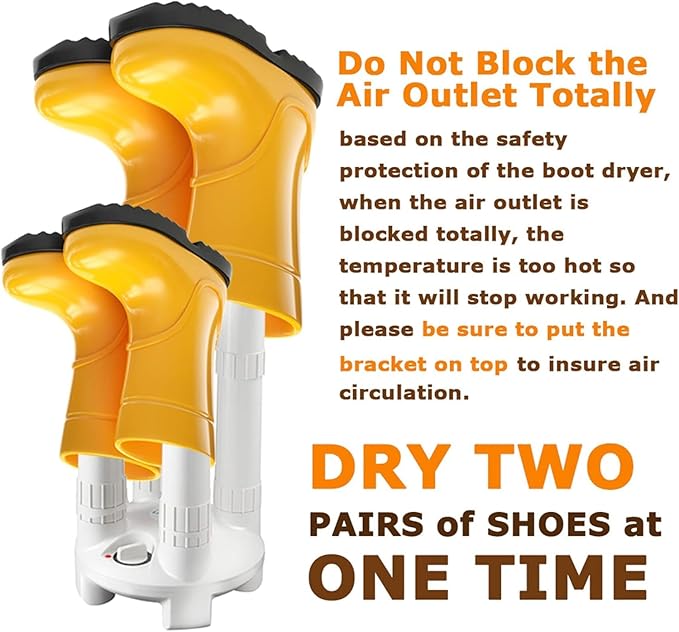 - FAST DRY- With a 250-watt heating coil and a motor inside, this heavy boot dryer is capable to dry any damp shoes, boots or gloves within 2 hours.