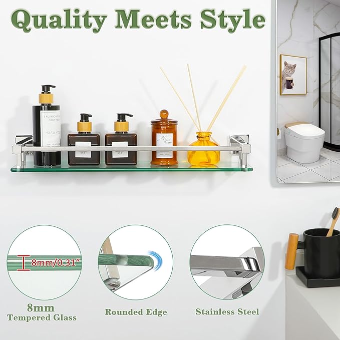 - TEMPERED GLASS:Our glass shelves are made with ultra-strong 8mm tempered glass and SUS304 stainless steel, ensuring a weight capacity that far exceeds standard shelves for reliable support