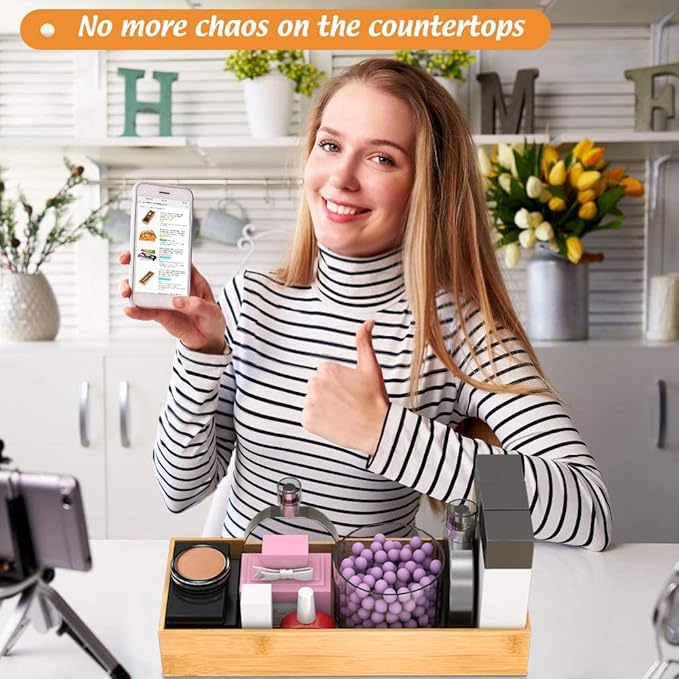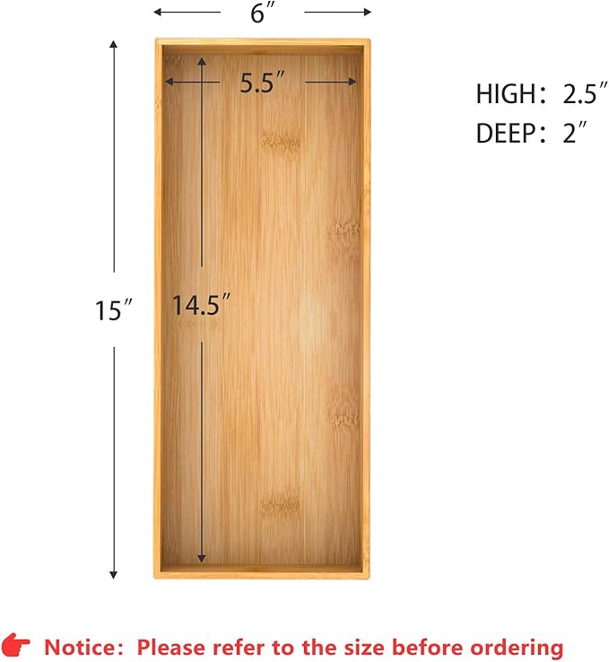 - 【Multi-functional Storage Box】 This deep bamboo organizer boxes are good for organizing items, such as forks, spoons, and knives in kitchen; brushes, soap dispenser and toilet paper in bathroom; cosmetics, makeup tools and hair accessories in makeup room; documents, pens and paper clips in office. Try this bamboo storage box organizer - ending clutter in your office desk and kitchen drawer.