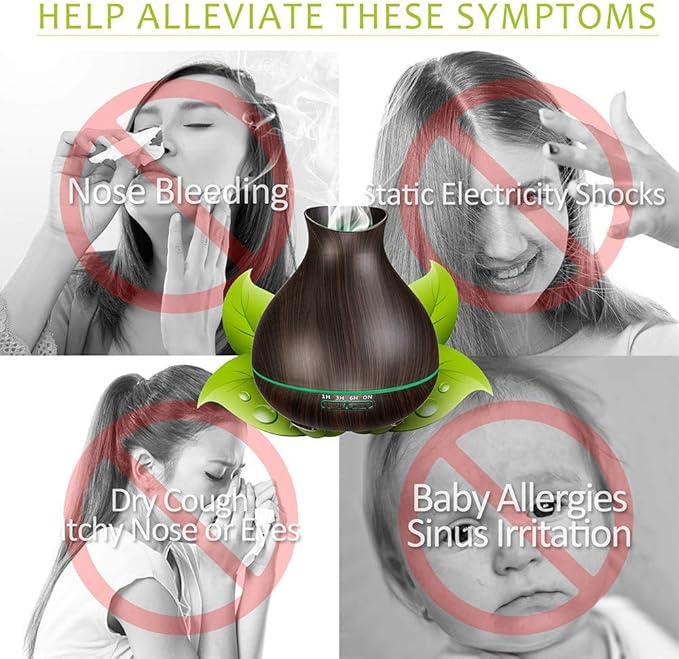 - REDUCE DRY CLIMATE IN WINTER: This aromatherapy diffuser helps to alleviate winter dryness by increasing air humidity. It improves breathing and sleep and reduces static shock in dry climates. Some essential oils can produce a healing effect that relieves your sinuses and can help you breathe better when you use an air conditioner. A great gift for yourself, parents, friends, and partners.