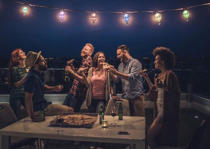 - The multi colored string lights lampshades are made of a weatherproof and shatterproof plastic, can withstands wet weather and extreme temperatures. Patio string lights UL listed for outdoor/indoor use. IP44 grade waterproof, make sure the exterior decorative hanging string lights work normally in rainy days, and the metal mesh outside the bulb could protects the novelty string lights from damage. Note: Please ensure that the plug is in a dry environment during use.