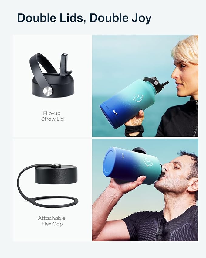 - 2 Caps Pack: This 64 oz stainless steel water bottle comes with straw lid and flex cap, the flex cap is perfect for the beach, camping and hiking, while the straw lid is suitable for cycling and road trip
