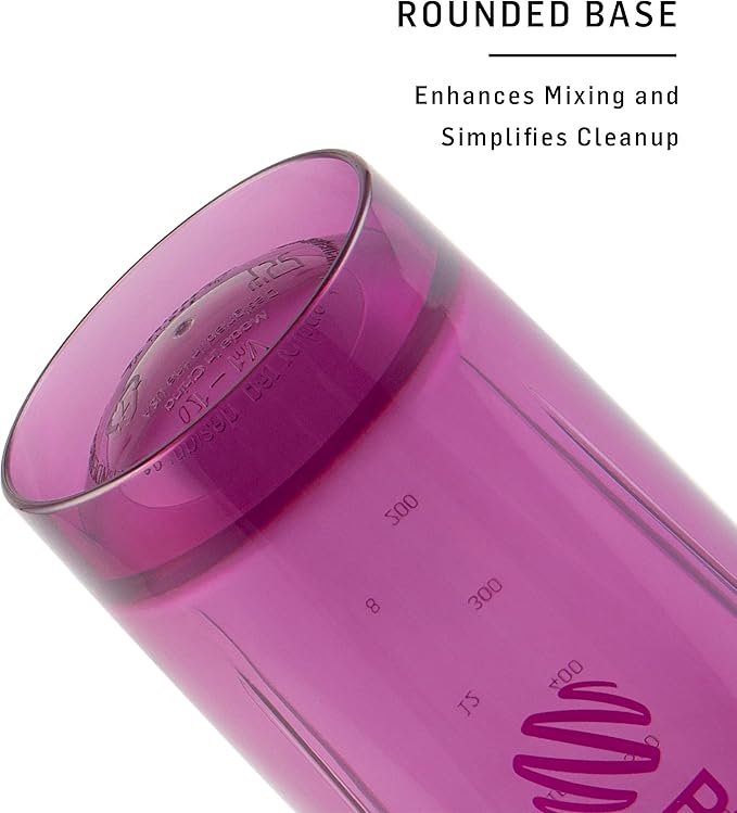 - Wide mouth makes it easy to add mix scoops and liquids, and embossed markings measure both ounces and milliliters; rounded base for thorough mixing