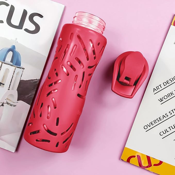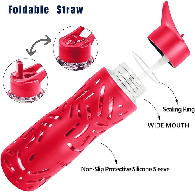 25oz Glass Water Bottles with Silicone Sleeve, 3 Different Lids (BPA Free) for Wide Mouth Glass Drink Bottles for Fitness and Outdoor (Red)