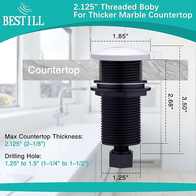 - EASY TO INSTALL - Garbage Disposal Switch Button can be easily mounted on any countertop or sinktop by drilling a 1-3/8-inch diameter hole. 3-inch thread plunger is not only for stainless steel sink top, but also for thick counter top like granite, marble, quartz, wooden and more.