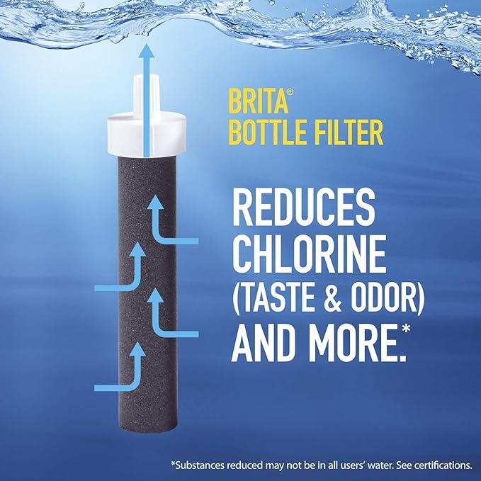 - The filter reduces chlorine (taste and odor) and more with every sip; compatible with Brita water bottle replacement filters