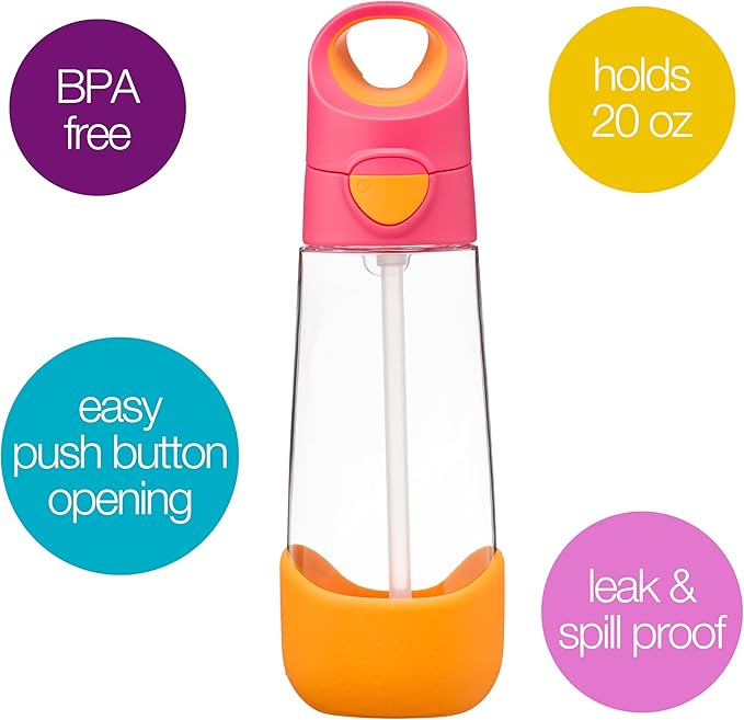 - B.BOX 20 OZ TRITAN DRINK BOTTLE: Our lightweight and super durable Tritan straw water bottle keeps kids hydrated at school, sports and on the go. Features a unique triangle shape for easy grip—designed for little hands to hold and control.