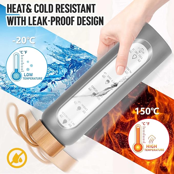 - Your Ultimate Hydration Partner: Our clear glass drinking bottle are made of borosilicate glass, which is dishwasher safe, leak proof, BPA, BPS, PVC, lead, and cadmium free. These durable and aesthetic reusable glass time water bottles will not crack under extreme temperature and pressure
