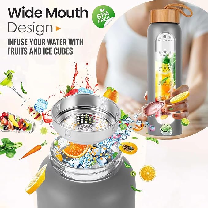 Aqulea Glass Water Bottles 32 Oz with Silicone Sleeve - BPA Free Reusable Wide Mouth Glass Motivational Water Bottles with Fruit Infuser – Leak Proof Borosilicate Water Bottle with Time Marker (Grey)
