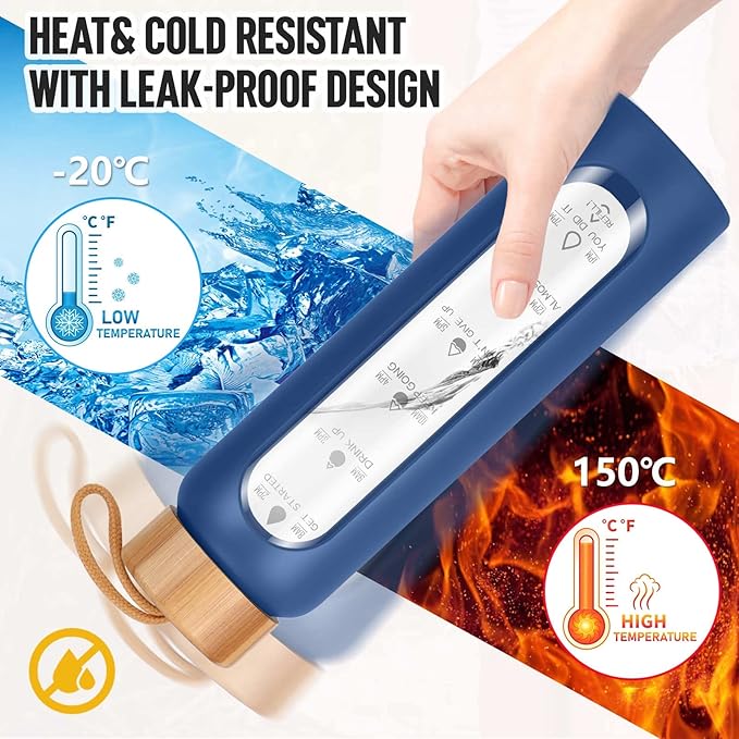 - Your Ultimate Hydration Partner: Our clear glass drinking bottle are made of borosilicate glass, which is dishwasher safe, leak proof, BPA, BPS, PVC, lead, and cadmium free. These durable and aesthetic reusable glass time water bottles will not crack under extreme temperature and pressure