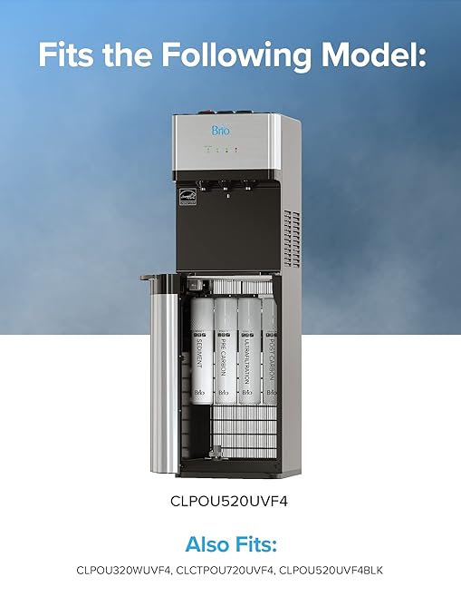 - Replacement filter kit: Compatible with Brio 4-Stage Ultrafiltration Water Cooler Dispensers, including CLPOU520UVF4, CLPOU320WUVF4, CLCTPOU720UVF4, and CLPOU520UVF4BLK