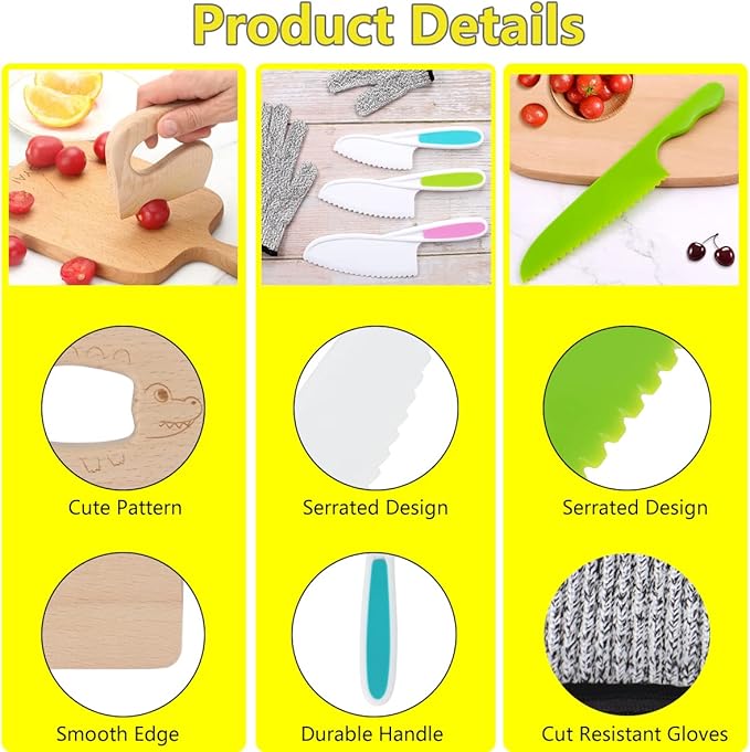 - What is Include: You will receive 1 piece of crocodile wood kids knife, 1 pair of cut resistant gloves(Ages 6-12), 1 piece green cooking knife and 3 pieces serrated edges toddler knives, meet your children daily different usages or demands