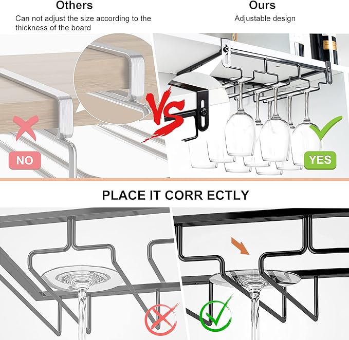 - 【Adjustable Wine Glass Rack】You can adjust the rack's mezzanine width to fit your cupboard, fit for 0.2-1.6in thickness(0.5-4CM). The perforation-free installation design makes the wine glass holder not only suitable for wooden partitions, but also for floating plates of different materials such as stone plates and glass partitions.