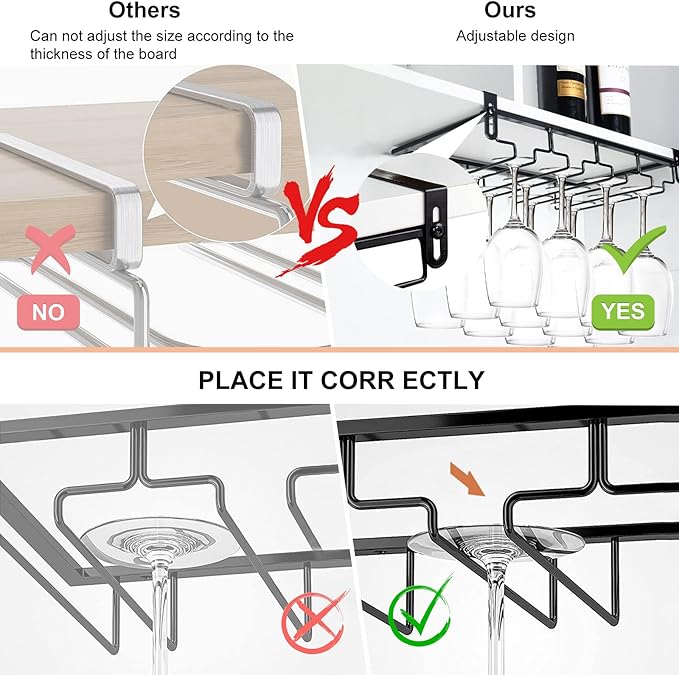 - 【Adiustable Wine Glass Rack】You can adjust the rack's mezzanine width to fit your cupboard, fit for 0.2-1.6in thickness(0.5-4CM). The perforation-free installation design makes the wine glass holder not only suitable for wooden partitions, but also for floating plates of different materials such as stone plates and glass partitions.