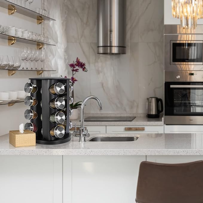 Black Countertop Rotating Spice Rack, 16-Jars Revolving Spice Rack Organizer Tower, 135 Spice Labels with Funnel Complete Set, Seasoning Organizer for Kitchen Countertop, Cabinet