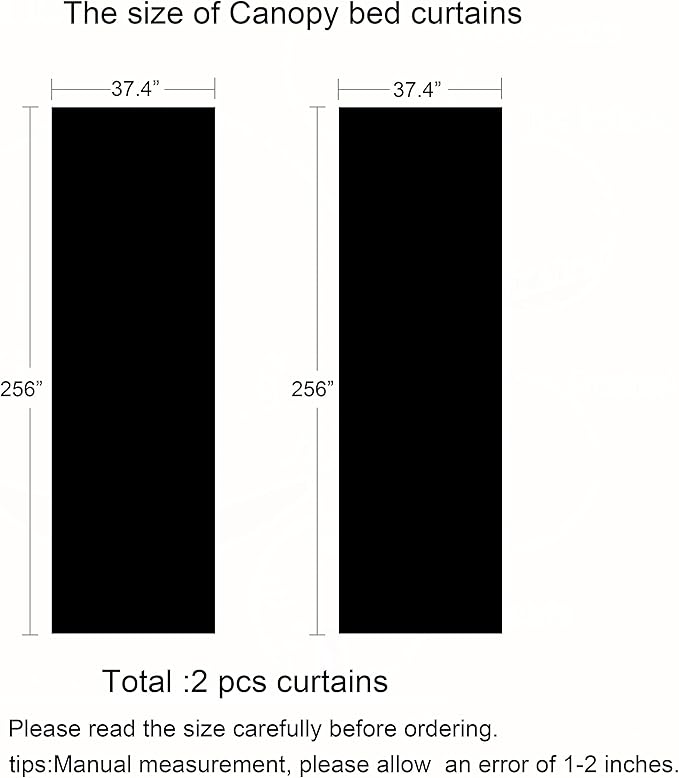 - Size detail:37.4" X 256" each curtain. This canopy curtains is suitable for all bed sizes.Pls check you bed or bed frame dimension before you buy.You could use for metal/wood bed frame , house bed,carrige bed.Put this this sheer canopy scarf in baby nursery room,girls bedroom,boho/princess style room,etc.