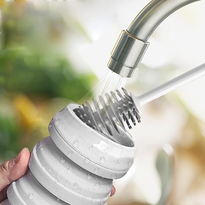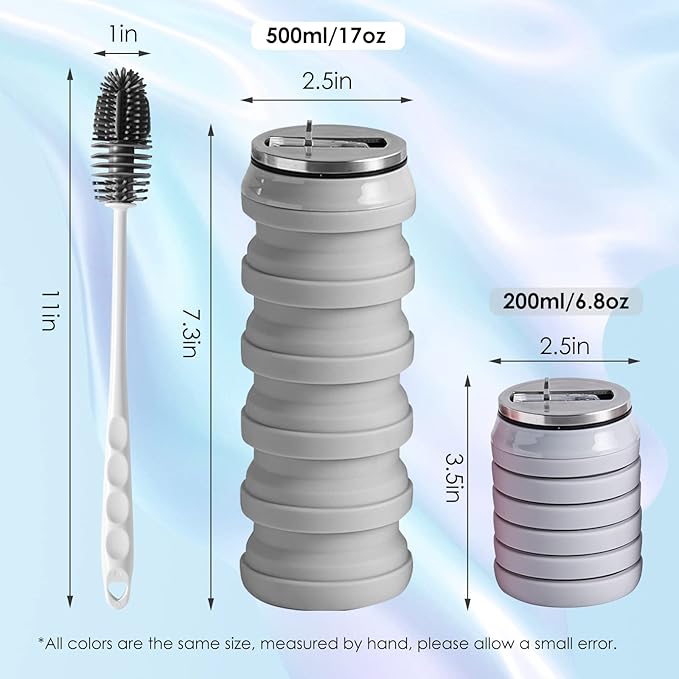 - đđŒăSET INCLUDESă: Set includes 1-pack of collapsible water bottles and a silicone brush, made of food-grade silicone BPA Free, 500ml/17oz.Only 3.5 inches when folded, 200ml/7oz. Portable and easier to store.
