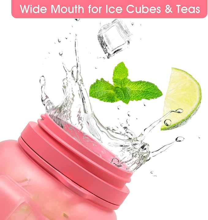 - Wide-mouth water bottle, free to add ice cubes and make fruit teas: The bottle 65mm diameter wide-open mouth makes it easy to clean. Not as other plastic gallon water jug, this hydrated water bottle can be wristed and rubbed to remove sendimentary factors on the bottle wall. The water tracker bottle body can contain water temperature between -40 degree to 200 degree, you can add ice cubes and other tea supplements.