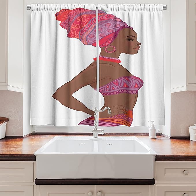 Ambesonne African Long Kitchen Curtains, Zulu Woman with Bandage Dress Necklace Female Illustration, Two Panels Drapes with Rod Pocket Room Decor, 55" x 45", Chocolate Purple