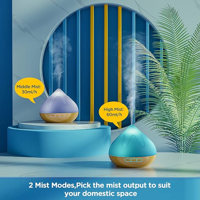 - 2 MIST MODES: Our diffuser can provide stable cool mist to increases your room humidity without make your furniture and your floor to get humid; You can aslo adjust the mist mode to get low Mist: 30ml/h and high Mist: 60ml/h by pressing the power button to fit your room size.