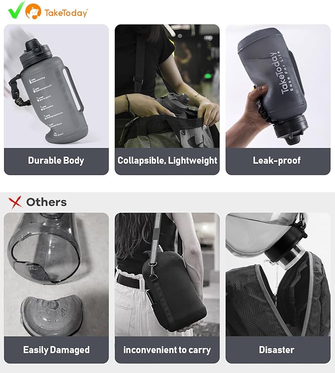 - SUSTAINABLE LIFESTYLE - We care about the damage single-use plastics are doing to our environment, and we're taking action. Taketoday collapsible water bottle is reusable, sturdy, and portable, reducing the need for single-use plastic bottles. The silicone material we used is eco-friendly and our packaging uses 95% less plastic. It makes an ideal gift for those who share a healthy and sustainable lifestyle.