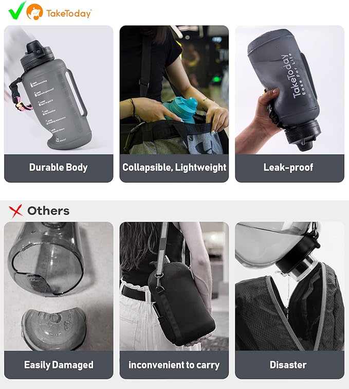 - Warranty: We stand behind the quality of our TakeToday half gallon collapsible water bottles and offer a 6-month limited warranty. If you experience any defects in materials or workmanship, our 24-hours customer service team will do our best to make it right.