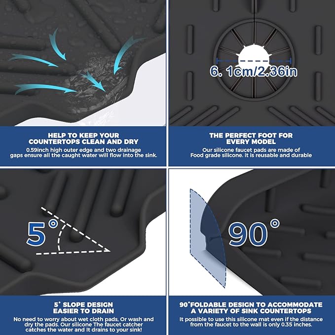 - đȘăKEEP YOUR COUNTERTOP DRYă Silicone faucets pad new designed for faucet splash with the draining, upgrading your kitchen sink & bathroom countertop in an effort-saving way! This means never gets soggy, or any water spots by the faucet. You don't need to worry about the water staying on the mat or counter.