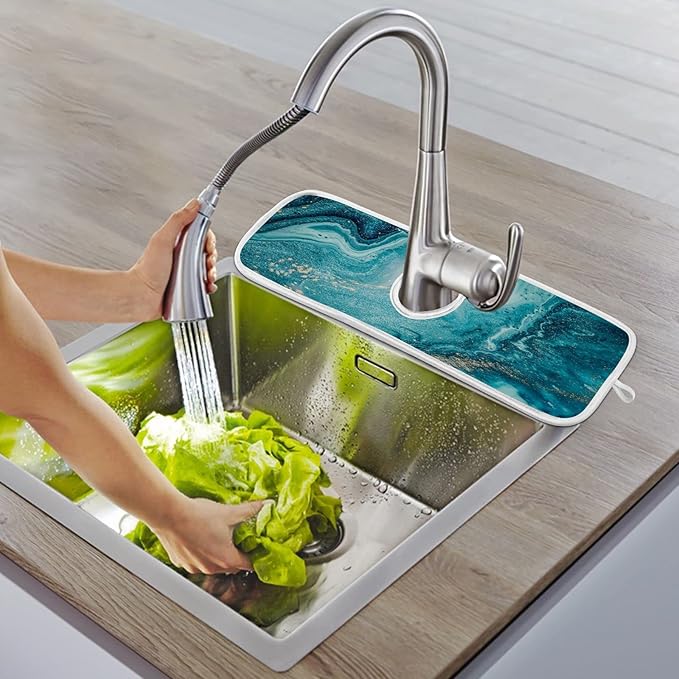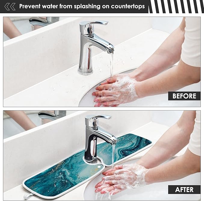 - DECORATION FOR KITCHEN BATHROOM: Using these Faucet Splash Catchers with our unique design, timeless color and seamlessly blends into your home to create perfect Sink Accessories, add a touch of luxury in your kitchen&bathroom will give your house an amazing makeover and elevate your home decor.