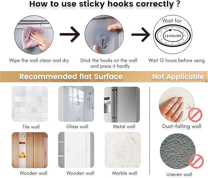 - 【How to Use】1) Stick the hook on any smooth clean dry surface and press it tightly to remove any bubbles. 2) Wait 12 hours to adhere the hook firmly. 3) Finally, you can hang the hanging bag on the hook to enjoy it.