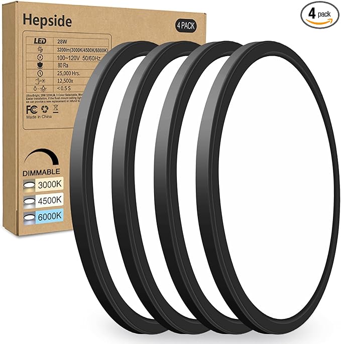 4PACK Flush Mount LED Ceiling Light Fixture Black, 12Inch 28Watt, Dimmable & 3000K-4500K-6000K 3 Color Selectable Ceiling Lamp 3200LM Low Profile Ceiling Light for Kitchen Bedroom Hallway Porch