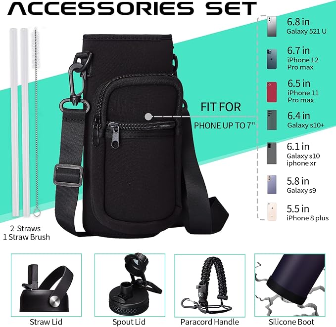 - COMBO—Super Deal: Buy 40oz stainless steel water bottles and get 9 accessories (2 x lids, 1 x survival paracord, 1 x carrying pouch, 1 x shoulder strap, 1 x protective cup mat, 2 x straws, 1 x straw brush). WITH A LIFETIME GUARANTEE, these thermal water bottles are the perfect gift for use at home, work, school, road trips, hiking, sporting events, or just hanging out