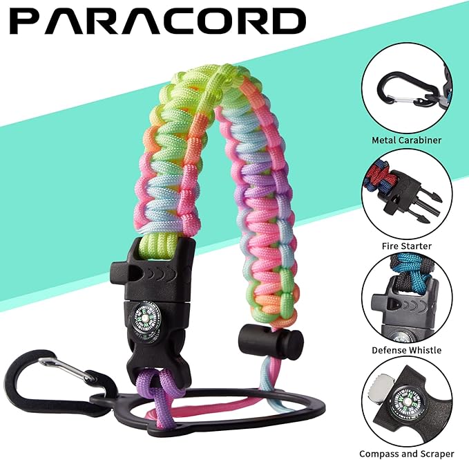 - UNIQUE PARACORD—Perfect Accessories: bright color paracord matches the flask water bottle to give you a youthful vibe while adding a personal style. It comes with a compass, safety loop, metal carabiner, flint, igniter, and whistle to become your survival tool for your wild adventures.