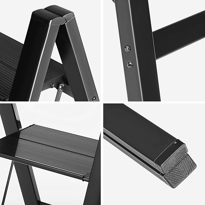 - Anti-slip & Dirt-Resistant Design, Wide Pedal: Wide pedals of the step stool are covered with Non-slip grooves and Anti-dirt coating. You can get enough friction from the step ladder to prevent accidental slipping. Four ladder feet of the 3 step folding ladder are equipped with non-slip rubber, fit the ground 100%. Not only to reduce wobble, but also protect your precious floor.