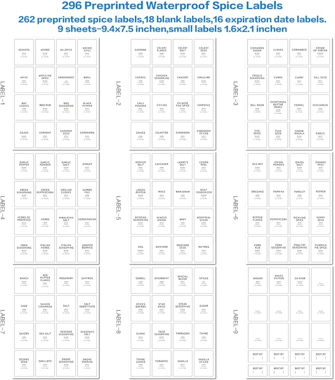 - 【BLACK AND WHITE WATERPROOF SPICE JAR LABELS】Our bamboo lid spice jars labels of black and white color. Include 262 preprinted spice labels, 18 blank labels, 16 expiration date labels.