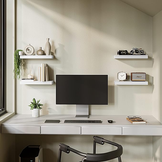 - WIDE SHELF BOARDS: The Bameos White Wall Shelf will maximize space without taking up any square feet - each board measures 15.7” L x 5.8” W x 1.5” H; Reduce clutter and highlight decor in a compact space - giving the illusion of more space in your studio apartment, dorm room or small living area and so on