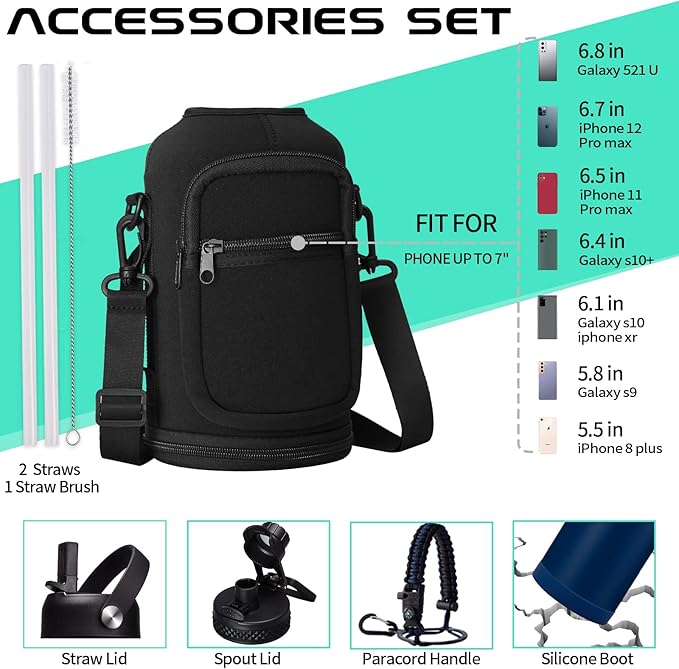 - PROTECTIVE BOOTS & STORAGE SLEEVE: Upgraded silicone boots prevent shattering and cracking when stainless steel water bottle accidental dropped. And storage carrying pouch with removable shoulder strap for convenient hands free carrying! The safe zippered pocket design to stores all your stuff, holds your cards & phone & key