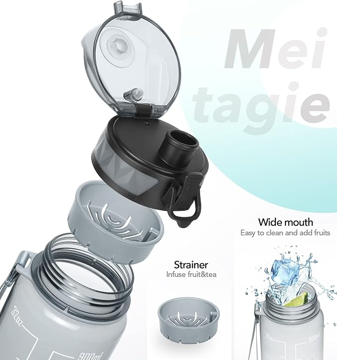 32oz/26oz Motivational Water Bottle with Time Marker & Fruit Strainer, Leak-proof BPA Free Non-Toxic 1l Bottle with Carrying Strap, Perfect for Fitness, Gym and Outdoor Sports, Plastic