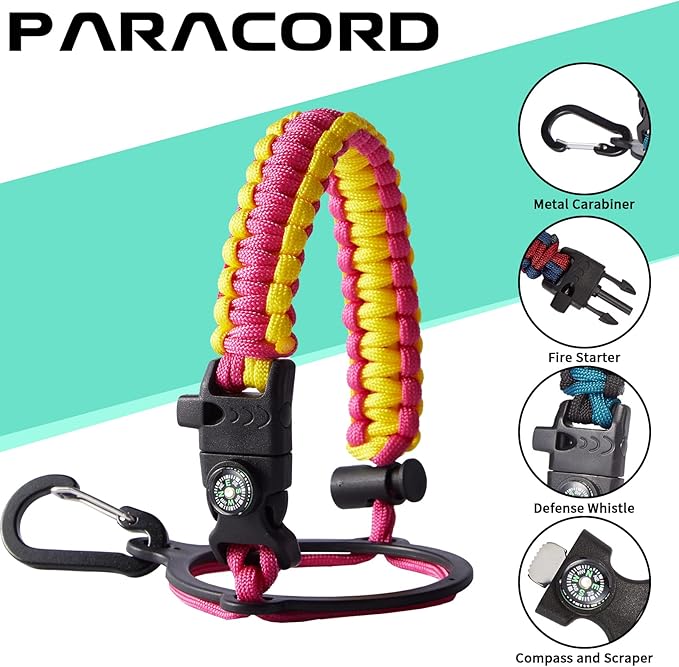 - UNIQUE DESIGNS PARACORD HANDLE: Full-function paracord handle made in individual styles to match the color of the flask water bottles. With compass, safety ring, carabiner, flint fire starter & whistle. It unravels into a sturdy and taut rope in an emergency, making the large water jug an ideal survival kit for expeditions in the wild