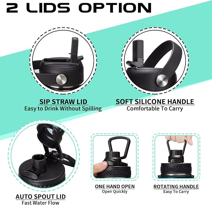- 2 LID OPTIONS (Auto-spout & Straw): two different lids are complete LEAK PROOF & design for easy drink. The pops-up lid for easy drinking and seals shut for no leaks when you're on the go. The straw lid makes it easy to enjoy spill-proof sips, and package come with a alternative straw & a straw brush for easy cleaning