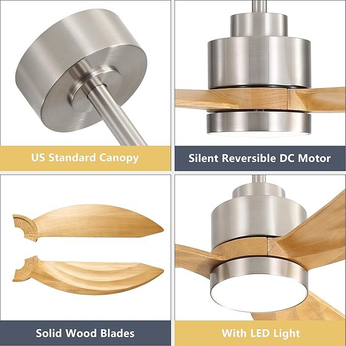 52" Wood Ceiling Fan with Lights and Remote Control, 3 Blades 6-Speed Dimmable Light Reversible DC Motor Ceiling fan for Kitchen Bedroom Dining Living Room, Wood Blades with Nickel