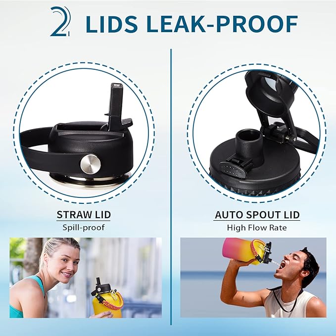- LEAK-PROOF 2 LIDS - AUTO SPOUT LID & STRAW LID meet you different drinking need, and both lids are leak proof and with handle for carrying on the go. The pop-up spout lid features a button for one hand open quickly, and a large water outlet for fast drinking. The straw lid with straw lets you enjoy perfect spill-proof sipping to all your outdoor adventures, also can prevent the inhalation of ice cubes