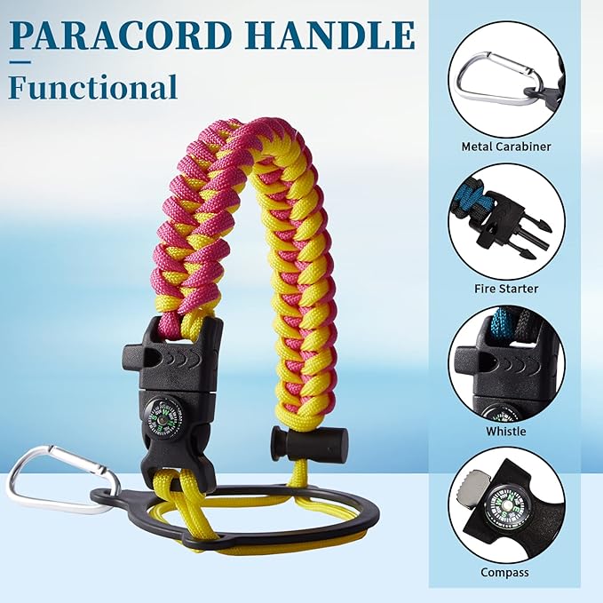 - PERSONALIZATION BOTTLE PARACORD HANDLE - Thermo water bottle with a pretty cool functional paracord handle which does more than meets the eye. The survival strap cord made of military grade nylon, with compass, safety loop, metal carabiner, flint, igniter and whistle. Can help you out if you were in a survival situation while hiking, camping or everyday life