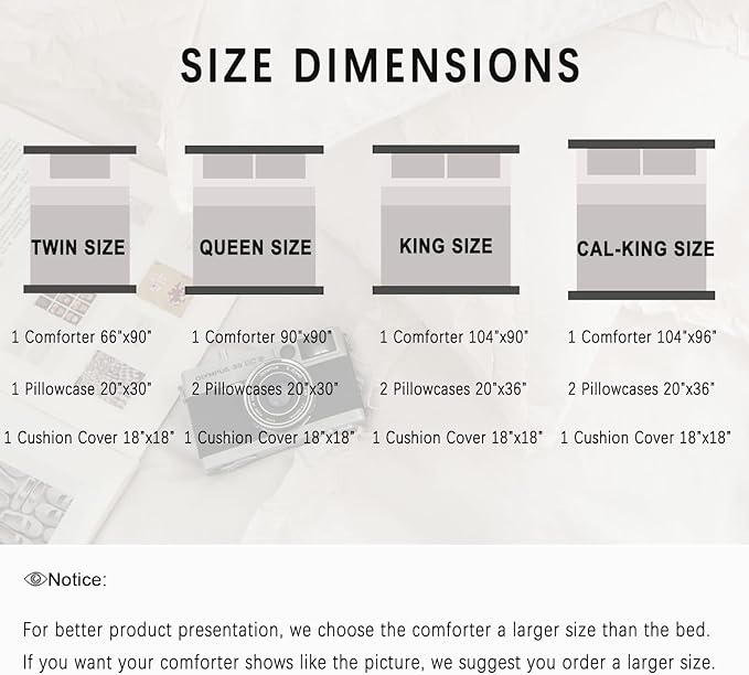 - California King Size : 4 Pcs California King Comforter Set includes one comforter measures 104x96 inches, two pillow cases measure 20x36 inches, and one decorative pillowcase measures 18x18 inches