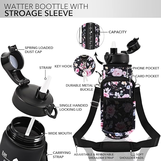- INSULATED STORAGE SLEEVE: Our water bottle is designed with a high quality skeleton sleeve, which not only can protect the water jug from slight bumps, but also ensures you can see the time marker or capacity marker at all times. Zipper pocket can store your phone, card, airpods, etc. Comes with a adjustable & removable padded shoulder strap that can be adjusted from 25" to 50" to offer you more carrying options and hands free.