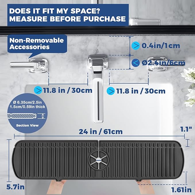 - That there must be no obstructions within a length of at least 11.8 inches on the left and right sides of the faucet. Otherwise there is not enough space to put silicone faucet handle drip catcher tray.