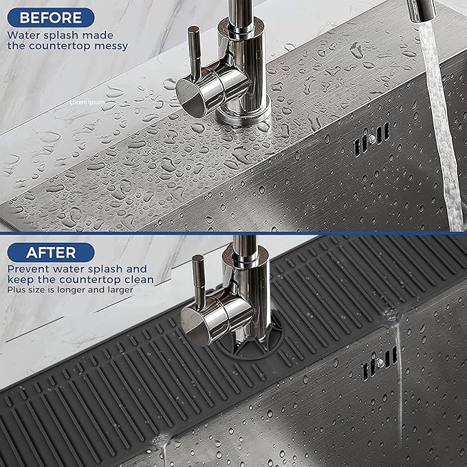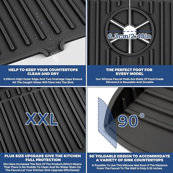 - đȘăKEEP YOUR COUNTERTOP DRYă Silicone faucets pad new designed for faucet splash with the draining, upgrading your kitchen sink & bathroom countertop in an effort-saving way! This means never gets soggy, or any water spots by the faucet. You don't need to worry about the water staying on the mat or counter.