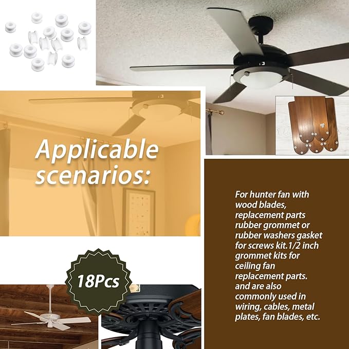 - √【Applicable scenarios】:For hunter fan with wood blades, replacement parts rubber grommet or rubber washers gasket for screws kit.1/2 inch grommet kits for ceiling fan replacement parts. and are also commonly used in wiring, cables, metal plates, fan blades, etc.