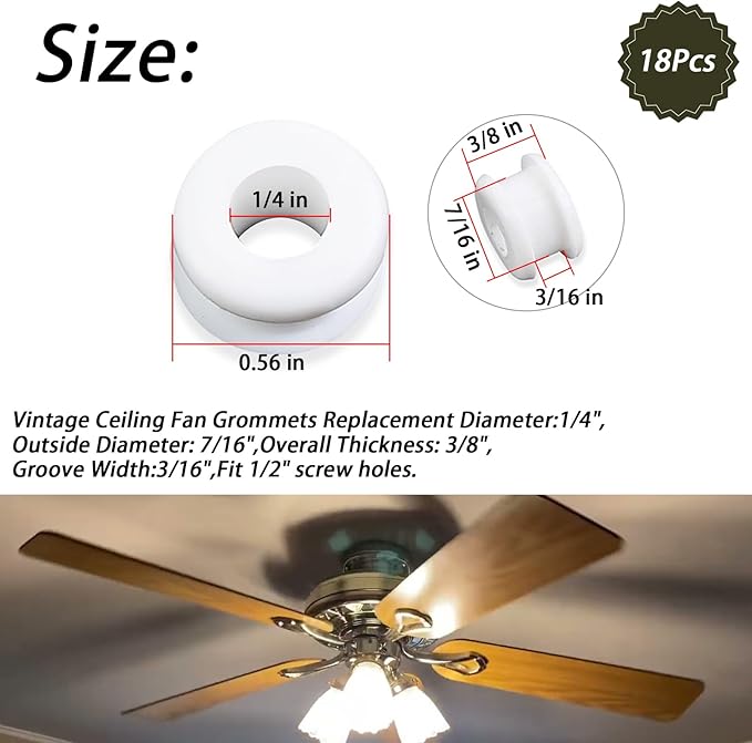 - √【Size】: Vintage Ceiling Fan Grommets Replacement Diameter:1/4",Outside Diameter: 7/16",Overall Thickness: 3/8",Groove Width:3/16",Fit 1/2" screw holes.