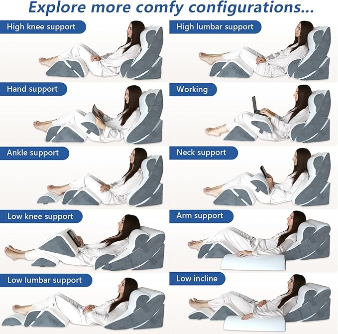 - 【Soft & Supportive Gel Memory Foam】The back pillow, lumbar pillow and the head pillow of the wedge pillow set are made of soft memory foam with gel particles, which ensures comfortable and refreshed even with prolonged use. The base pillow, leg pillow and knee pillow are made of high-density foam, which provides sufficient support and will not deform after long-term use.